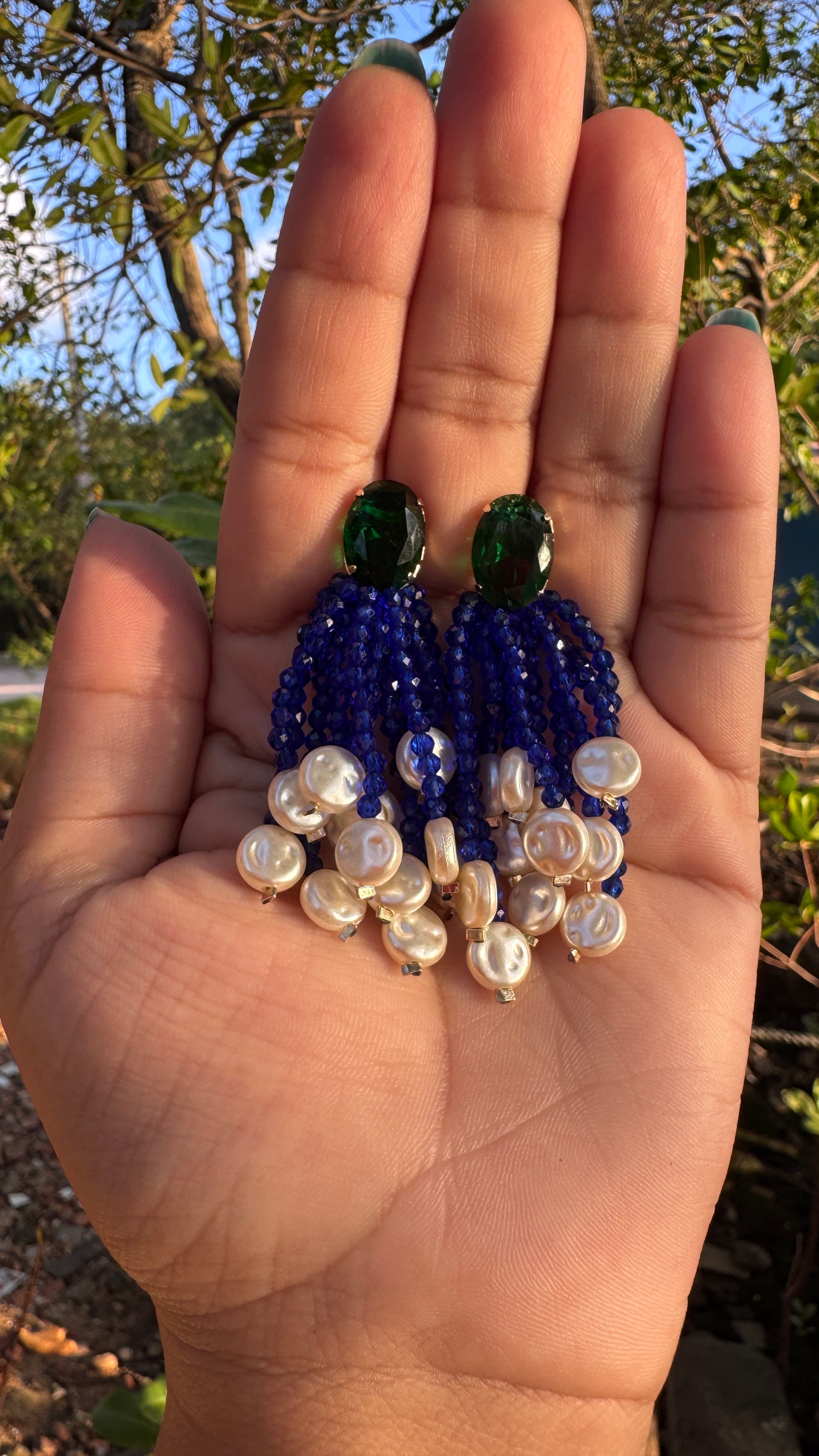 Brinco franjas repicadas de cristais com pontas de pérolas abs. Base zircônia. Levíssimo!
