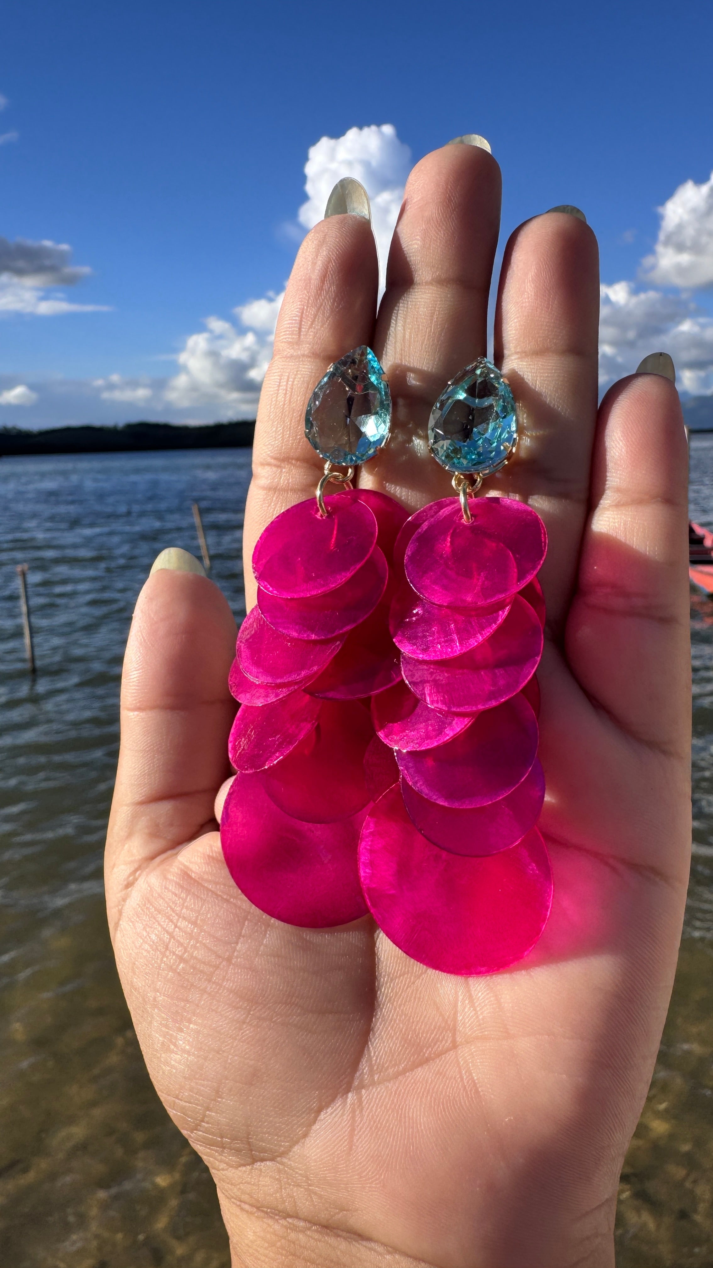 O Brinco Giovana em fúcsia apresenta franjas de madrepérolas metalizadas, complementadas por uma base em forma de gota com zircônia. Com 9 cm de comprimento total, este acessório proporciona um toque sofisticado e ético, ideal para ocasiões que exigem elegância e requinte.