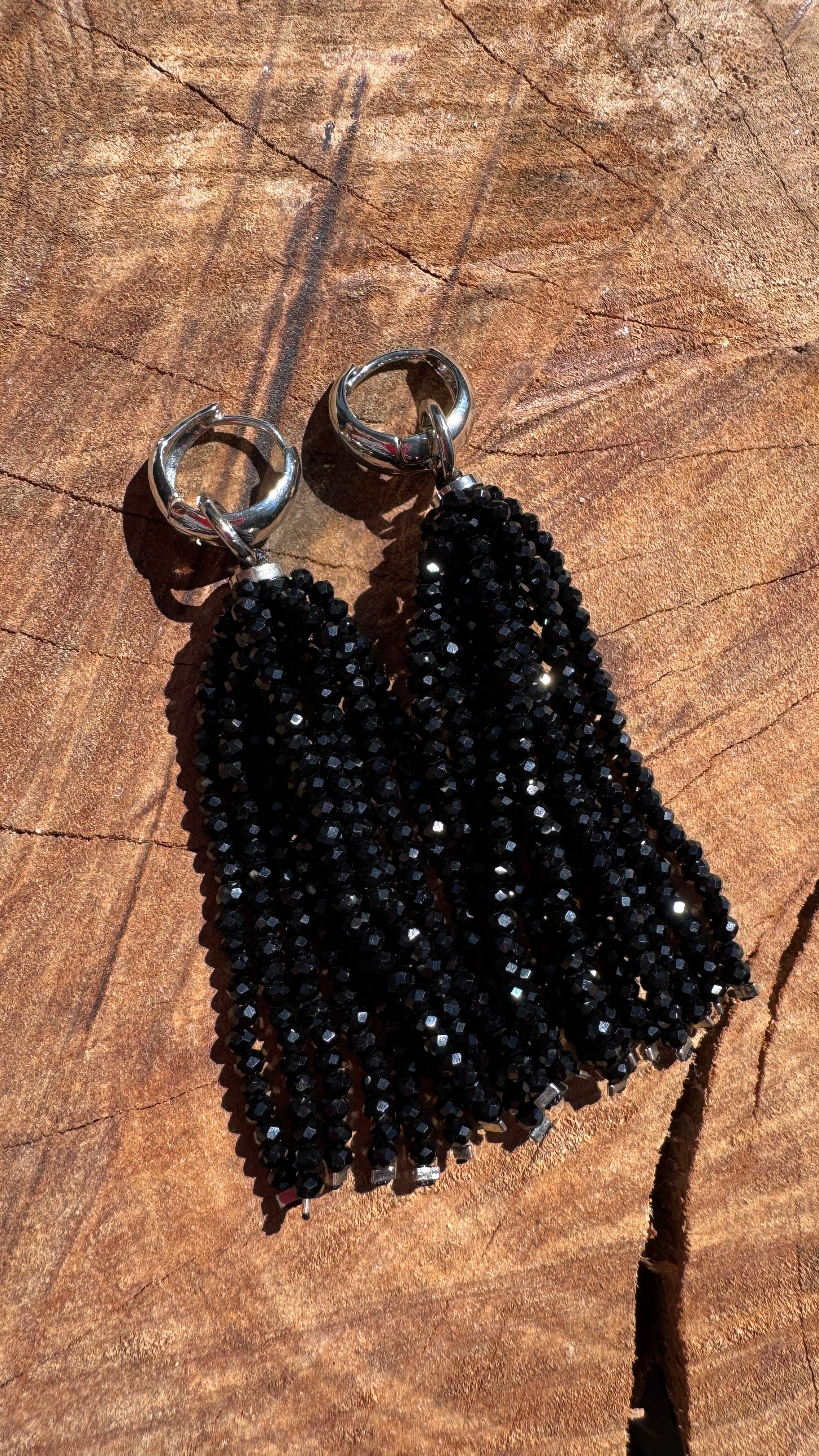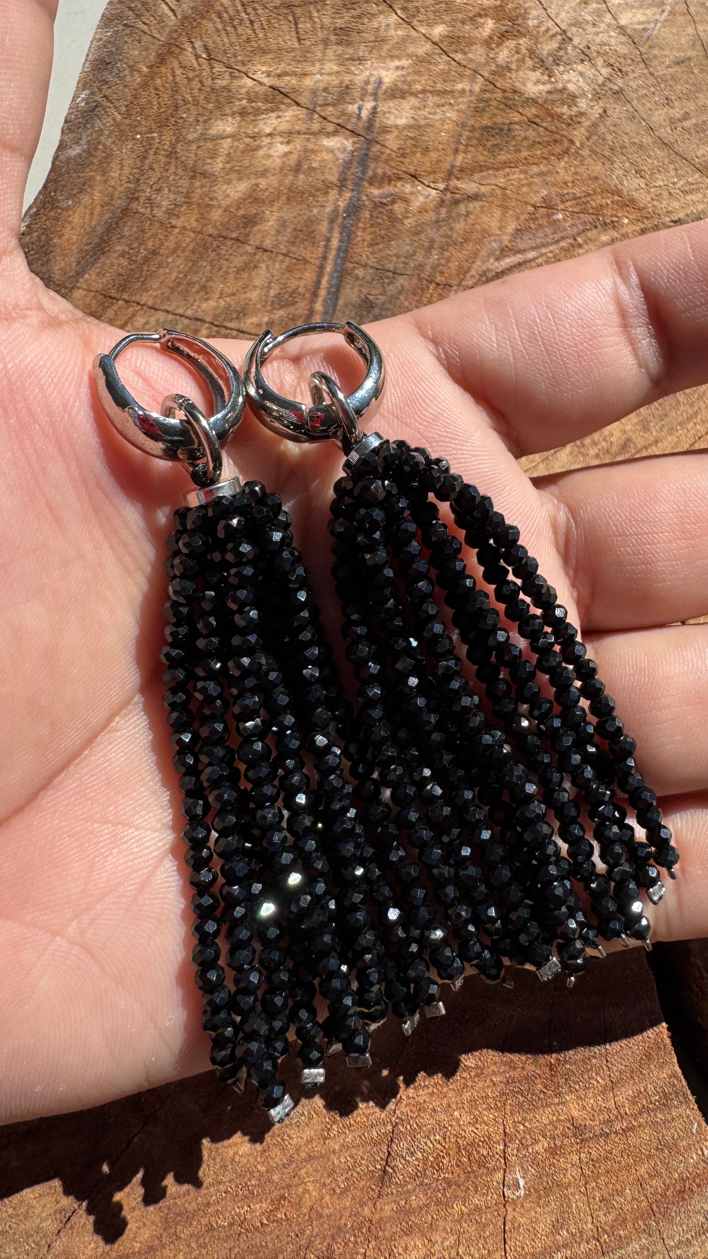 Brinco Zayah em preto com acabamento prata, apresentando franjas de cristais removíveis que garantem versatilidade ao seu visual. Com argola click de 8 cm e dez fios de cristal, oferece elegância sofisticada e praticidade. Os cristais destacam-se pela luminosidade, criando um efeito refinado que complementa tanto looks diurnos quanto noturnos. Ideal para quem busca acessórios premium que se adaptam a diferentes ocasiões.